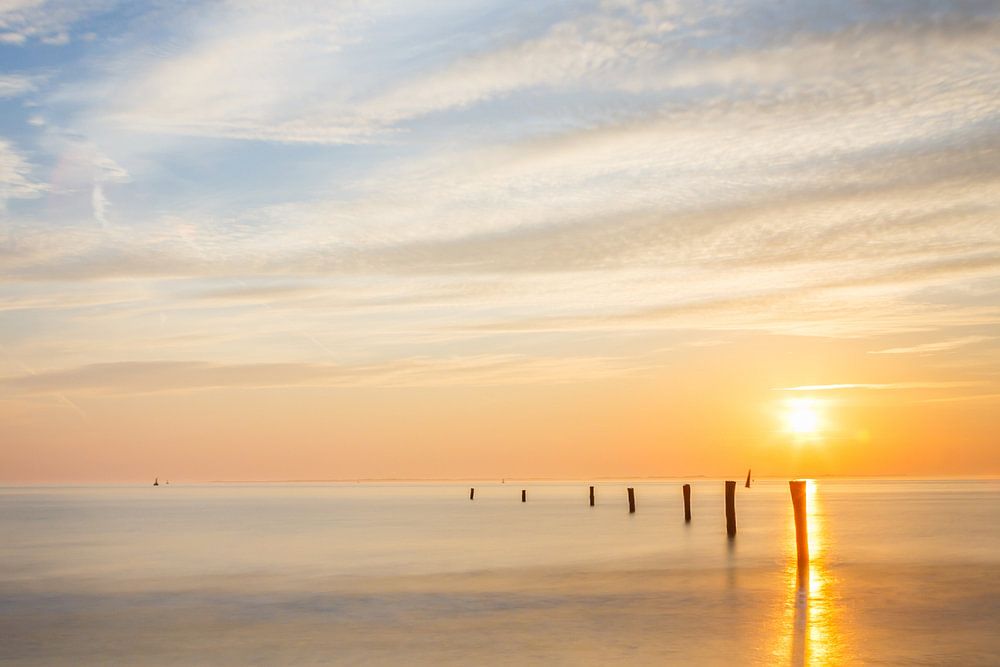 Magnifique coucher de soleil avec un ciel atmosphérique sur la plage de Norderney.
