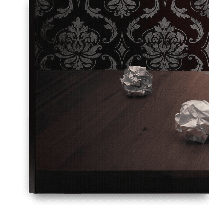 Sur une table en bois repose un livre qui tente désespérément d'écrire sa propre histoire. Ce livre, bien que silencieux et apparemment calme, dégage un désir intense de donner vie à ses mots. Autour du livre se trouvent quatre liasses d'histoires ratées, comme autant de témoins silencieux des tentatives précédentes qui ont échoué. Les liasses sont éparpillées, comme si elles avaient été jetées négligemment dans des moments de frustration et de désespoir.