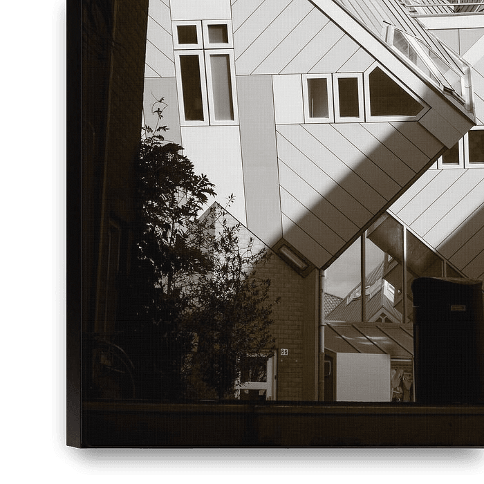 Dans cette œuvre, nous avons un aperçu excentrique de l'un des joyaux architecturaux les plus emblématiques de Rotterdam : les Cube Houses. En utilisant un cadre naturel au premier plan, les angles aigus et les formes abstraites du projet de Piet Bloom sont encore plus mis en valeur. L'interaction entre les lignes épurées des bâtiments…