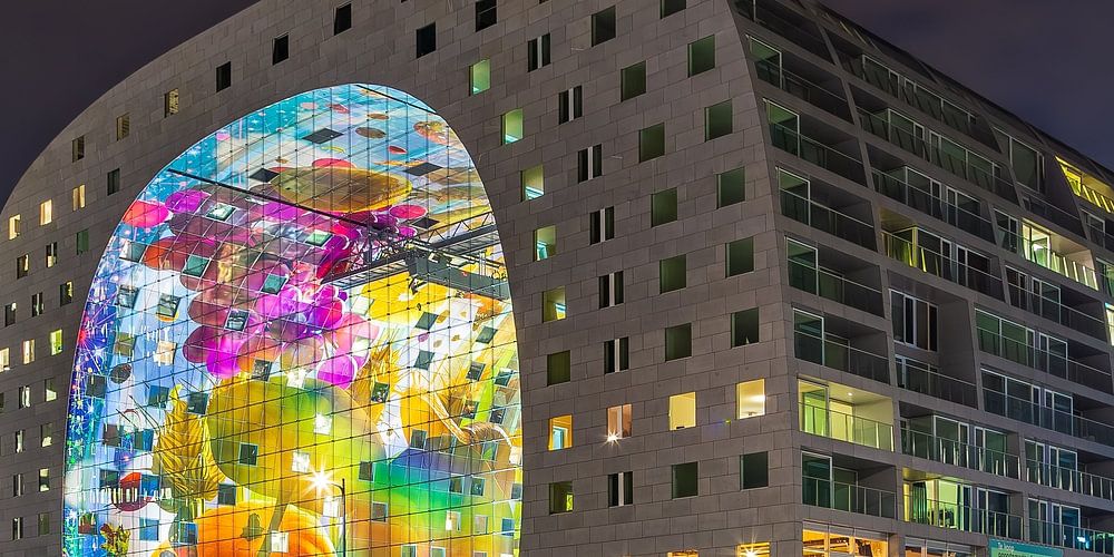 Cette photo de la halle du marché de Rotterdam a été prise un soir de novembre 2014. La halle du marché abrite plusieurs stands de marché, des restaurants et des bars. La canopée abrite plusieurs appartements. La photo a été prise à l'aide d'un trépied et d'une télécommande. La vitesse d'obturation utilisée est de 20 secondes et l'ouverture de f11.