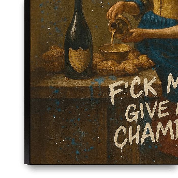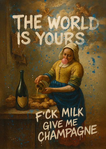 Une laitière hollandaise classique rencontre le street art insolent : au lieu de servir du lait, elle sert du champagne, mâche du chewing-gum et se tient devant un mur sur lequel est tagué en grand "THE WORLD IS YOURS - F*CK MILK GIVE ME CHAMPAGNE". Ce tableau allie la peinture ancienne de maître à la vibe rebelle des grandes villes -…