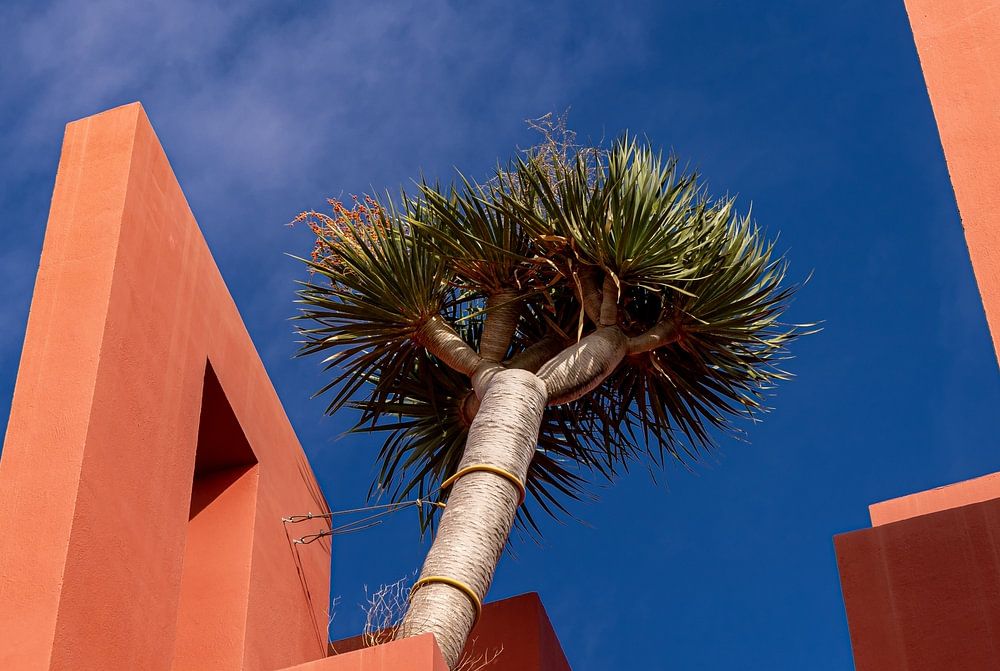 La muralla roja, ou muraille rouge, est un bâtiment bien connu de la ville de Calpe, sur la Costa Blanca, en Espagne. L'architecture est très particulière et présente de belles lignes et formes. Ici, nous voyons les murs, avec un morceau de nature, contre le ciel bleu.