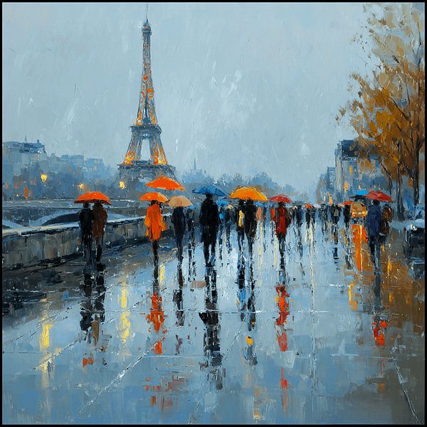 Cette œuvre d'art impressionniste atmosphérique, Le parapluie orange sous la pluie à Paris, montre un pont mouillé rempli de personnes avec des parapluies orange vif scintillant comme des points de lumière sous la pluie, avec l'emblématique Tour Eiffel mystérieusement en arrière-plan.