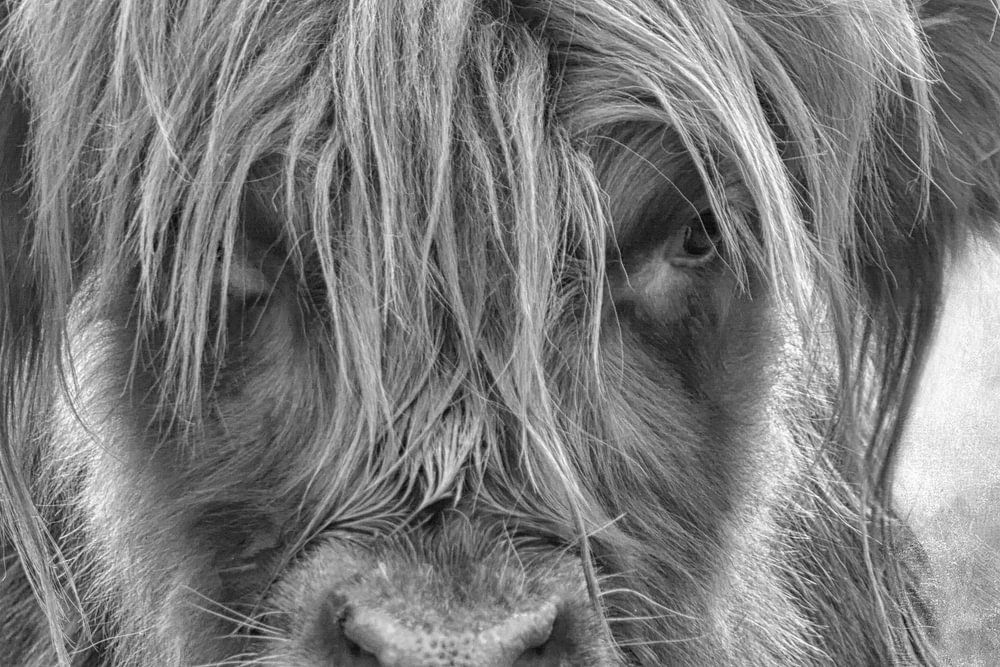 Un bovin écossais des Highlands avec le poil long et hirsute typique en noir et blanc. Un magnifique portrait d'un veau taureau