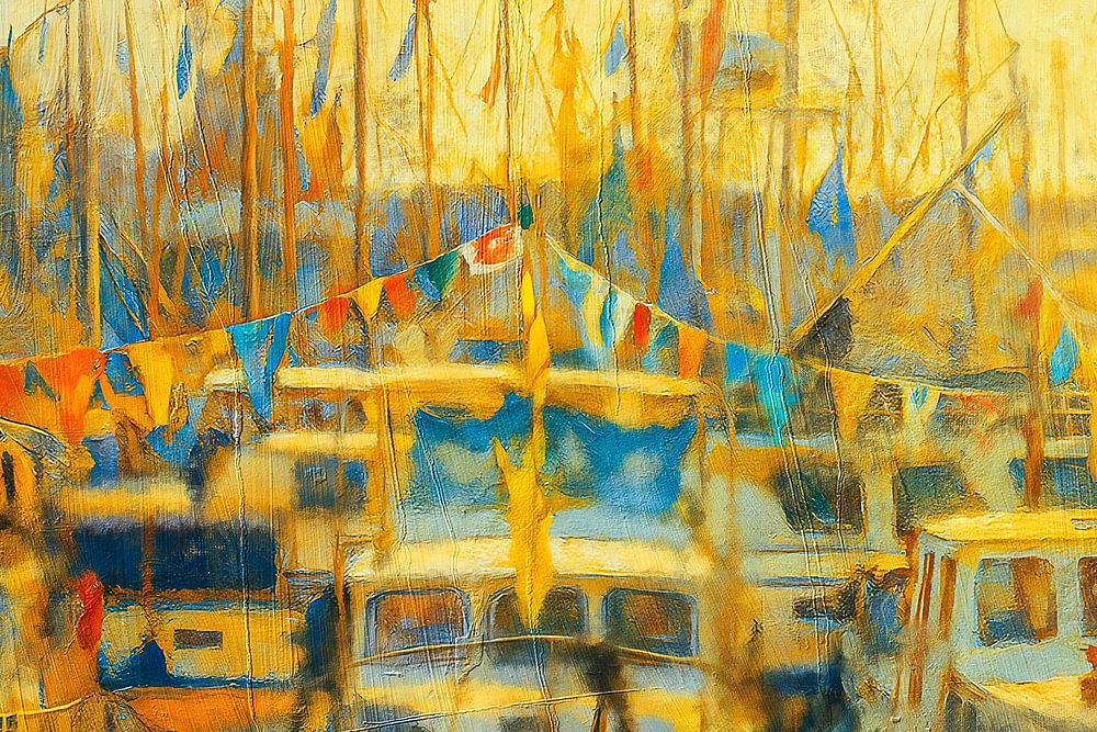 Dans cette peinture numérique atmosphérique, j'ai capturé le port de plaisance d'Ostende dans la douce et chaude lumière du matin. Le soleil jette ses premiers rayons sur les bateaux, donnant à l'eau et aux mâts un éclat doré. Les drapeaux colorés et les reflets sur l'eau donnent vie au port de plaisance, évoquant l'atmosphère calme et maritime typique d'Ostende, au bord de la mer.