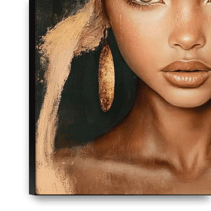 Ce portrait respire la force et l'élégance. La femme est représentée vêtue d'un foulard doré qui enveloppe son visage comme une couronne, rehaussant son éclat. Ses boucles d'oreilles en or et ses yeux radieux, qui reflètent la chaleur des teintes dorées, rendent son expression à la fois mystérieuse et irrésistible. Le fond sombre fait…