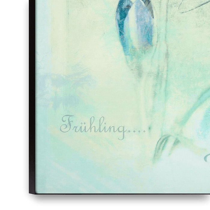 Photo art, trois crocus sur un fond vert pastel avec un poème allemand sur le printemps.
