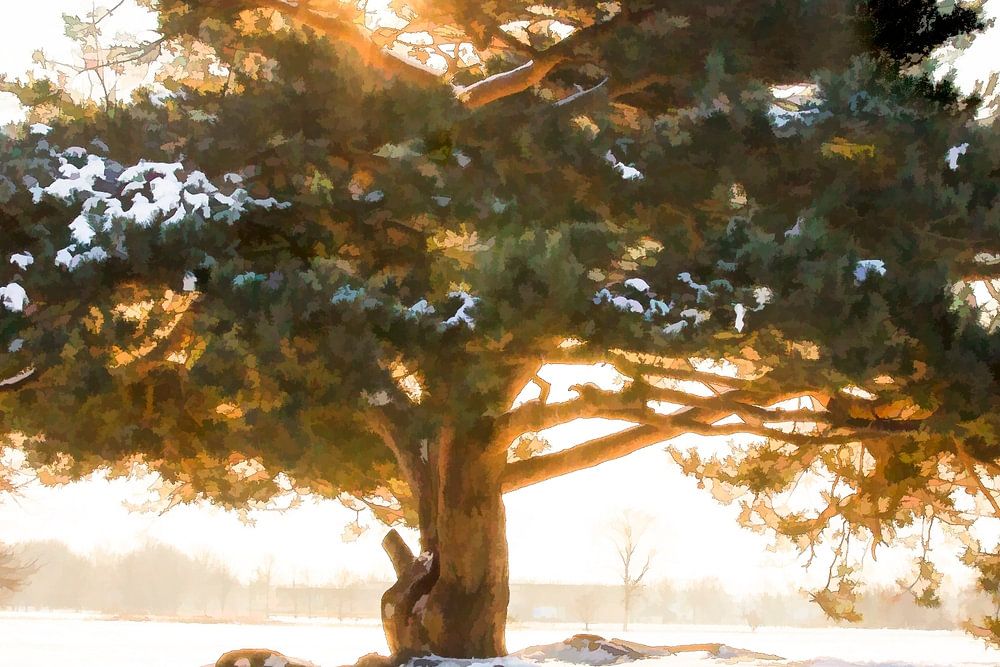 Beau grand arbre se dresse au milieu d'un paysage enneigé. Le soleil brille à travers l'arbre crée une ombre sur la neige. La photo a été éditée avec un effet aquarelle.