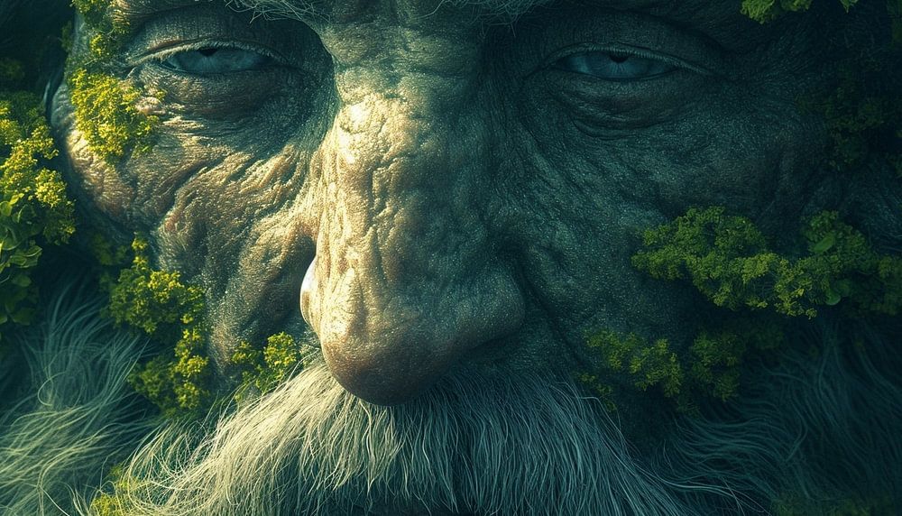 Un visage noyé dans la mousse et les fleurs sauvages respire la sagesse et la sérénité. Le vieil homme pourrait être l'esprit d'un arbre ancien, une présence mystique dans une forêt celtique, qui veille sur les connaissances de la nature et les histoires des temps lointains. Ses traits sont soigneusement sculptés à travers la verdure, comme s'il ne faisait plus qu'un avec la terre, un gardien de tout ce qui pousse et s'épanouit. C'est une représentation puissante de l'attachement à la nature, qui rappelle la vénération germanique des éléments et des anciens dieux germaniques. C'est un être magique et spirituel qui transporte le spectateur directement dans un conte de fées.