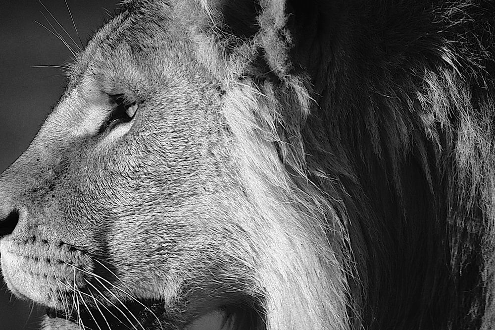 Kop vn een leeuw in zwart wit