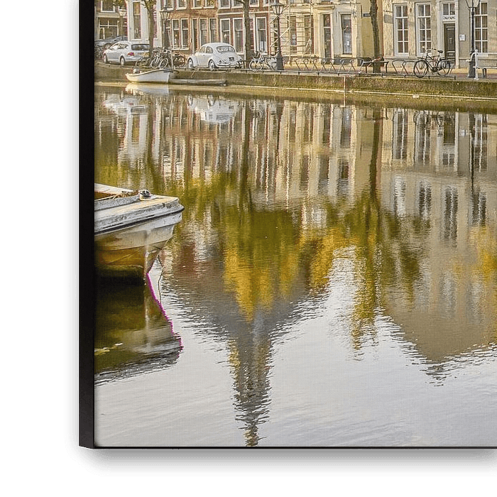 Leidse gracht in de vroege morgen met mooie spiegeling van het water en de opkomende zon. Bladeren verkleuren al naar herfsttinten en het vroege zonlicht maakt het af. De Leidse Schouwburg is gebouwd in 1705 op initiatief van acteur Jacob van Rijndorp en is daarmee het oudste nog in gebruik zijnde theater van Nederland. Gevestigd aan de Oude Vest te Leiden, op de plek van een afgebrande bierbrouwerij, is het onafgebroken in gebruik geweest als theater.