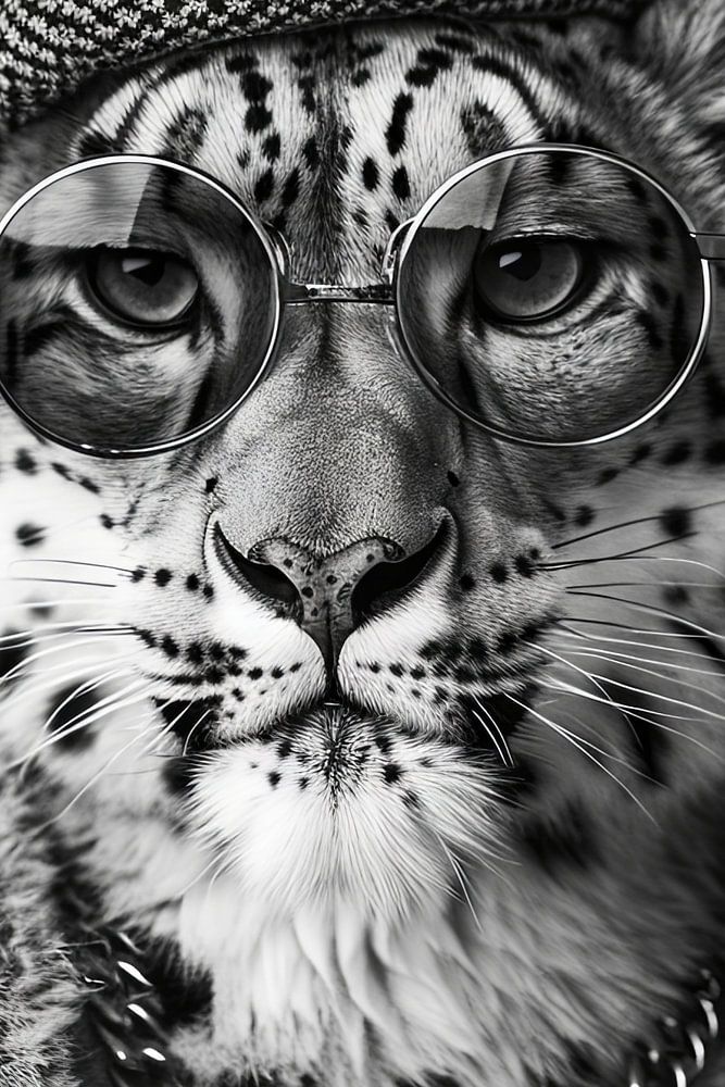 A propos de "Léopard des neiges en chapeau et lunettes, portrait en noir et blanc"