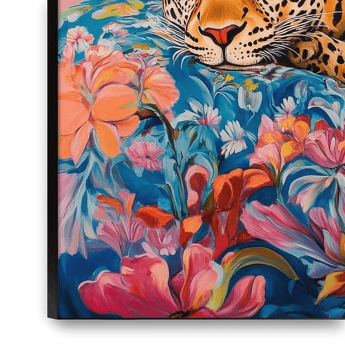 Avec une expression majestueuse, le léopard se repose sur un tapis coloré et fleuri de motifs floraux. Les couleurs vives des fleurs encadrent son pelage tacheté et créent un contraste fascinant avec le paysage de fond doux et pastel. Un jeu d'élégance et de nature qui envoûte les sens et invite au repos.