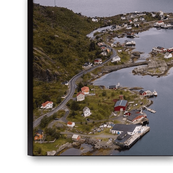 Les îlots des Lofoten avec les chalets colorés sur pilotis qui se dressent dans l'eau de mer. Les îlots sont reliés par de nombreux ponts.