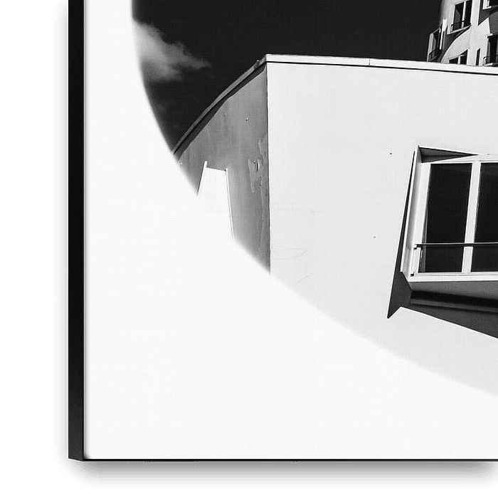 Gehry Bauten Düsseldorf am Rhein en noir et blanc dans un cadre ovale