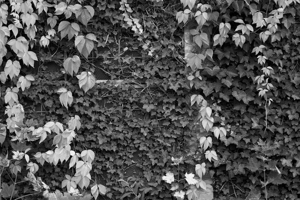 Des feuilles rouges s'étendent à travers une haie de lierre vert et annoncent le début de l'automne. Cette image est toutefois en noir et blanc, de sorte que les couleurs du feuillage ne peuvent être distinguées que par le clair et le foncé.