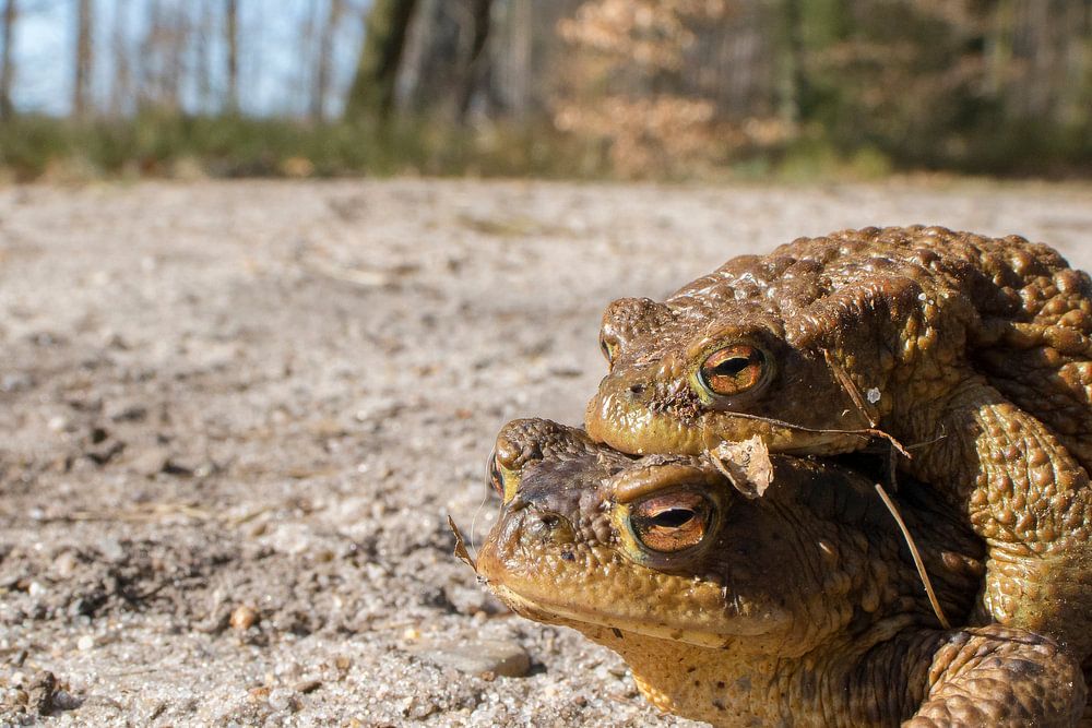 Chaque année, à la fin de l'hiver, les crapauds se réveillent de leur hibernation. Ces crapauds viennent de sortir du feuillage et se dirigent maintenant vers un bassin voisin. Là-bas, la première chose qu'ils font est de s'accoupler. Sur cette photo, le mâle est déjà sur le dos de la femelle (c'est ce qu'on appelle un amplexus) et le voyage sera donc difficile pour la femelle.