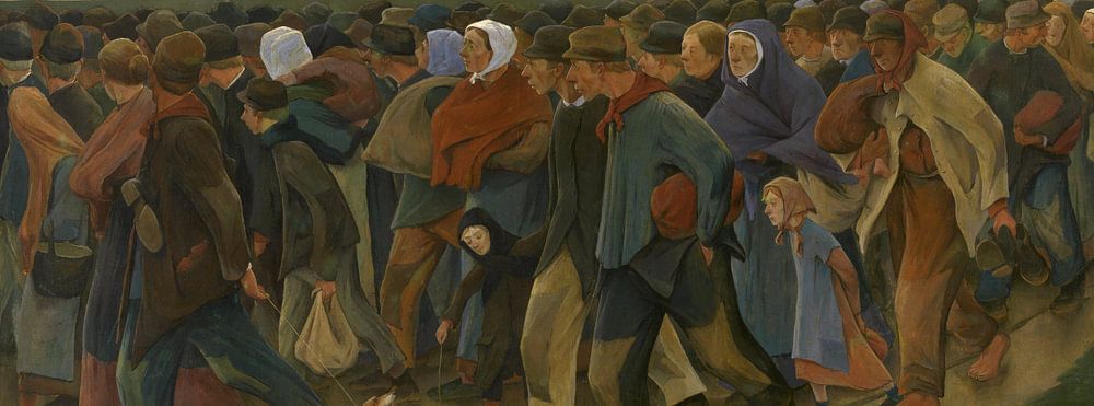 Eugène Laermans est un peintre belge du 19ème siècle. À la fin de ce siècle, de nombreux agriculteurs et ouvriers belges ont émigré aux États-Unis et en Amérique du Sud. Pour de nombreuses familles, cette aventure s'est terminée de manière tragique. La misère est un thème récurrent dans l'œuvre de cet artiste, que l'on retrouve également dans son tableau "The Land Removers". L'expression se trouve dans la représentation de silhouettes, de formes synthétiques, de contours anguleux et nets et de couleurs neutres et solides. "The Land Removers" est un magnifique triptyque, peint dans un style qui rappelle celui de Bruegel. Le tableau est plein d'émotion, les paysans et leurs femmes regardant une fois de plus leur village bien-aimé, qui semble déjà lointain au-delà de l'eau.