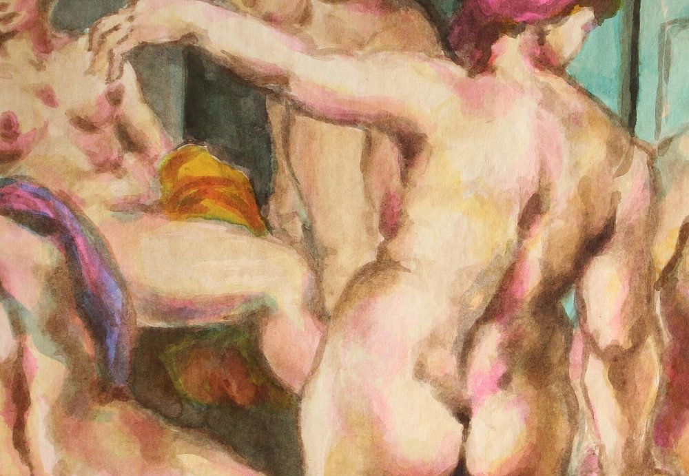 Dans ce portrait, cinq femmes se tiennent nues lors d'un rituel de bain. Deux nus sont représentés en décubitus dorsal, les fesses et les jambes exposées. Trois femmes sont représentées nues et de face, le torse et les seins nus.