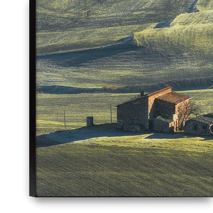 Découvrez le charme pittoresque du Val d'Orcia en hiver grâce à cette photographie captivante. Les fermes parsèment le paysage par un matin froid, où les champs prennent les teintes d'une peinture impressionniste, créant une scène sereine et enchanteresse.
