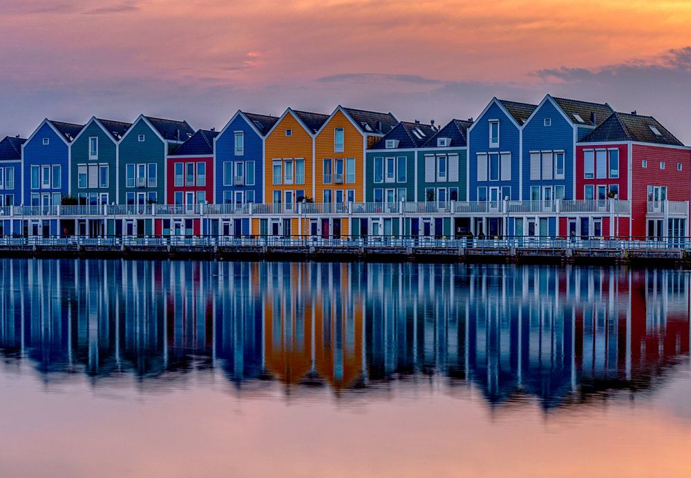 Les maisons arc-en-ciel de Houten, aux Pays-Bas, forment un ensemble joliment coloré avec le soleil couchant et les nuages colorés par elle.