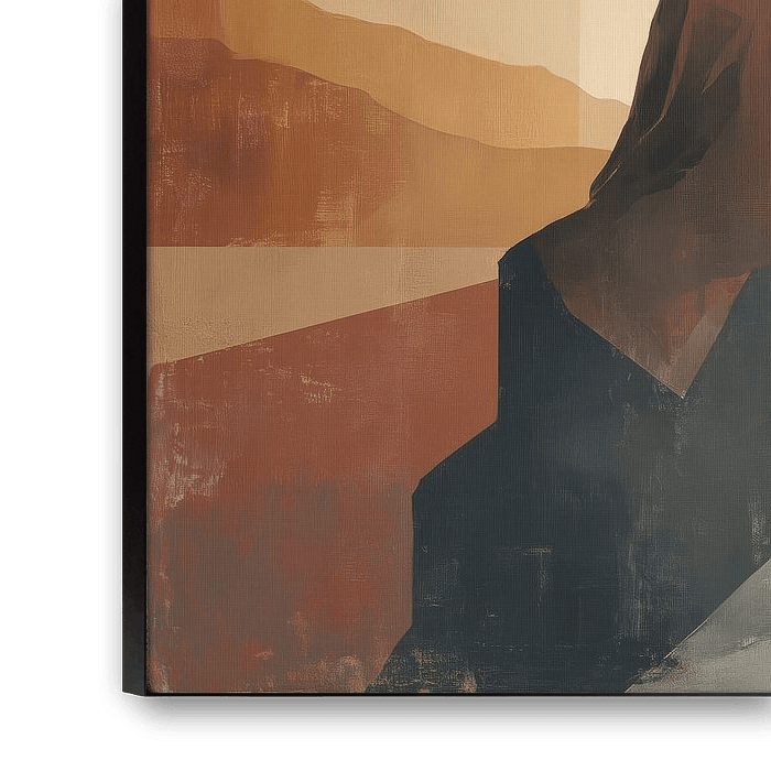 Une œuvre d'art numérique sereine aux tons chauds de terre dépeint un moment de contemplation où une silhouette solitaire contemple un paysage montagneux au coucher du soleil. La composition est composée de plans géométriques qui, associés aux couleurs chaudes, forment un ensemble harmonieux.
