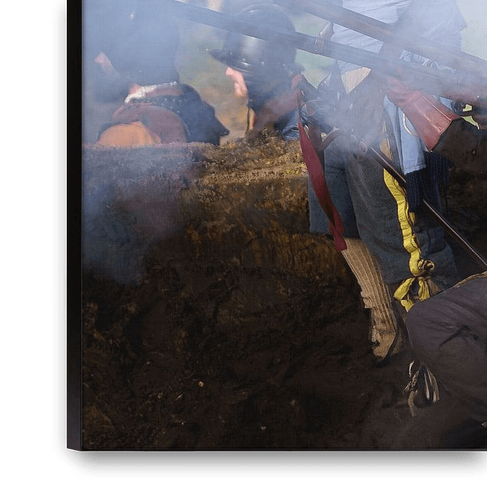 Une troupe de reconstituteurs en cosplay en action lors d'une scène de champ de bataille avec un éclairage latéral naturel atmosphérique provenant du soleil. La lumière de Rembrand donne un effet de contraste et de dynamisme à cette image dans laquelle des vapeurs de poudre et des tisons fumants s'échappent des canons des mousquets qui…
