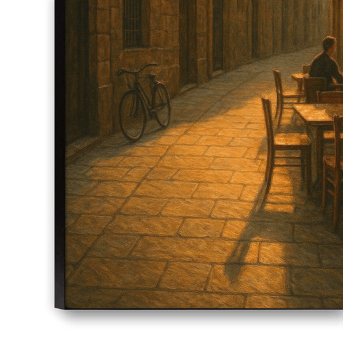 Les ruelles d'ambre de Barcelone révèlent un coin tranquille du quartier gothique juste avant la tombée de la nuit. La lumière dorée se glisse entre les vieux murs de pierre, effleure les balcons en fer forgé et brille à travers l'auvent d'un petit café. Deux personnages partagent un moment autour d'un verre, leurs silhouettes encadrées par la chaleur et le temps. La rue étroite, la bicyclette immobile, les pavés qui accrochent la lumière - chaque élément insuffle le calme au cœur de la ville.