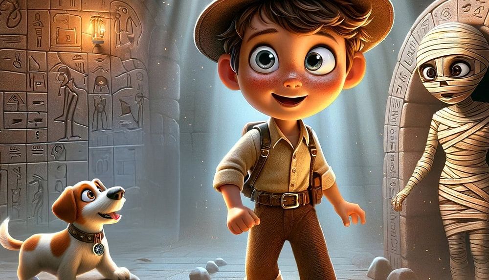 L'image nous plonge au cœur d'une chambre funéraire de l'Égypte ancienne, éclairée par un rayon de lumière divine qui passe par une ouverture dans le plafond. Max, notre jeune archéologue, se tient courageusement au centre, tandis que Buddy regarde avec intérêt les hiéroglyphes sur les murs. À côté de Max se trouve une momie grandeur nature, qui renforce encore le thème antique et mystérieux. Les peintures et inscriptions murales très détaillées éveillent la curiosité quant aux histoires qu'elles pourraient raconter. Ce tableau est parfait pour les fans de bandes dessinées et de dessins animés d'aventure et reflète un mélange d'histoire et de fiction qui ravira les jeunes explorateurs et lecteurs.