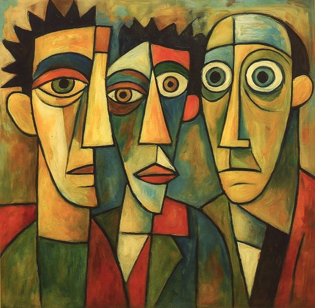"Viewers without Words" est une œuvre d'art puissante et expressive dans laquelle trois personnages se tiennent côte à côte, pris dans un monde de couleurs, de silence et de tension. Leurs grands yeux intenses attirent immédiatement l'attention, comme s'ils voulaient dire quelque chose mais ne le disaient pas. Les lignes cubistes et les formes géométriques confèrent à l'œuvre une énergie dynamique, presque inquiète.