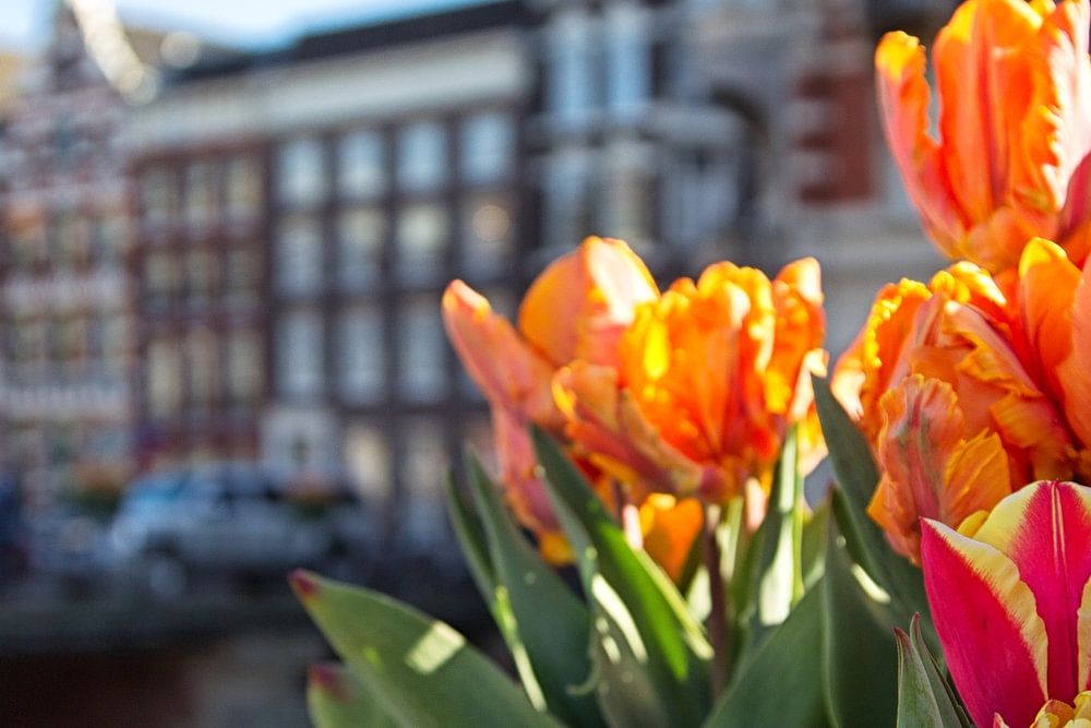 Tulipes multicolores sur un canal d'Amsterdam, Pays-Bas, au printemps.