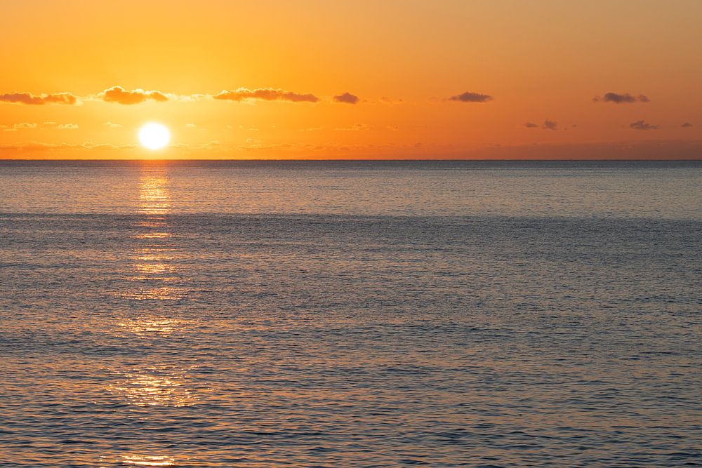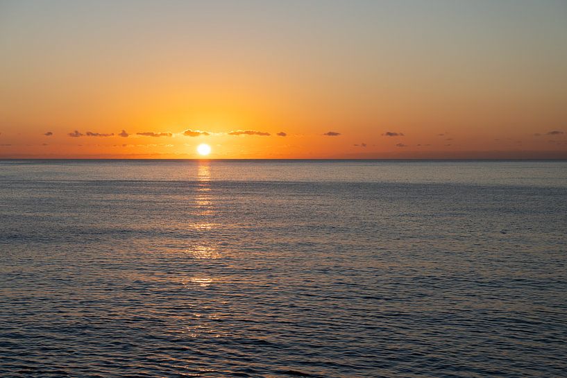 Le moment où le soleil se lève sur la calme Méditerranée. La lumière dorée du soleil fait briller le ciel dans des tons chauds et se reflète sur la surface légèrement ondulée de l'eau. La ligne d'horizon crée une séparation paisible entre le ciel et l'eau, tandis que la composition claire de l'image souligne l'immensité.