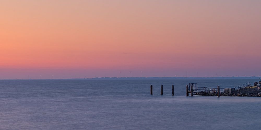 Image panoramique 2:1 d'un lever de soleil matinal au Paard van Marken, un phare situé sur la péninsule néerlandaise de Marken, non loin d'Amsterdam, sur l'IJsselmeer.