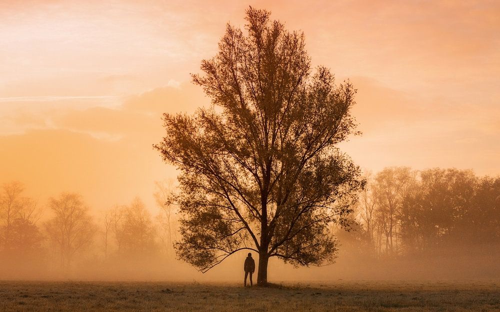 Photo panoramique d'un arbre avec une personne en dessous pendant un lever de soleil avec brouillard en Belgique, beau paysage dans la nature.