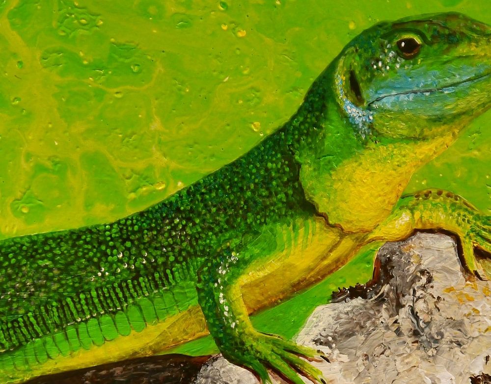 ? L'arrière-plan de l'image est réalisé avec une technique de coulée (Pouring ou Fluid Art), le lézard est peint avec précision et le rocher est mastiqué. Le vert intense rend l'image lumineuse et s'adapte bien à la couleur du lézard.