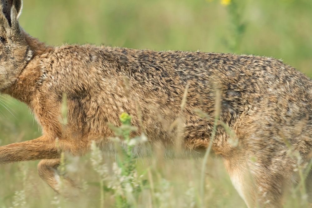 A propos de "Lièvre d'Europe ( Lepus europaeus ) courant dans une prairie fleurie au printemps, faune sauvage, Eu"