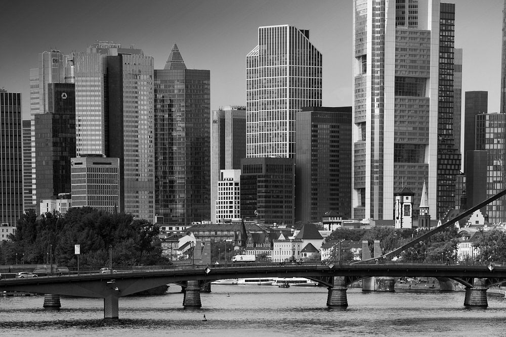 Vue en noir et blanc du centre d'affaires moderne de Francfort-sur-le-Main.