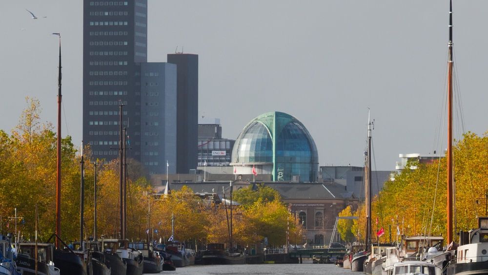 La ligne d'horizon de Leeuwarden depuis le 2e pont du canal. Vous pouvez voir les péniches sur le "nouveau canal" avec le dôme de la Frieslandbank et la tour Achmea en arrière-plan.