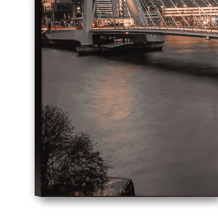 Skyline de Rotterdam le soir avec le pont Erasmus. Les couleurs sont le noir et le blanc avec ici et là la couleur rouge des feux de voiture et le jaune des lumières.
