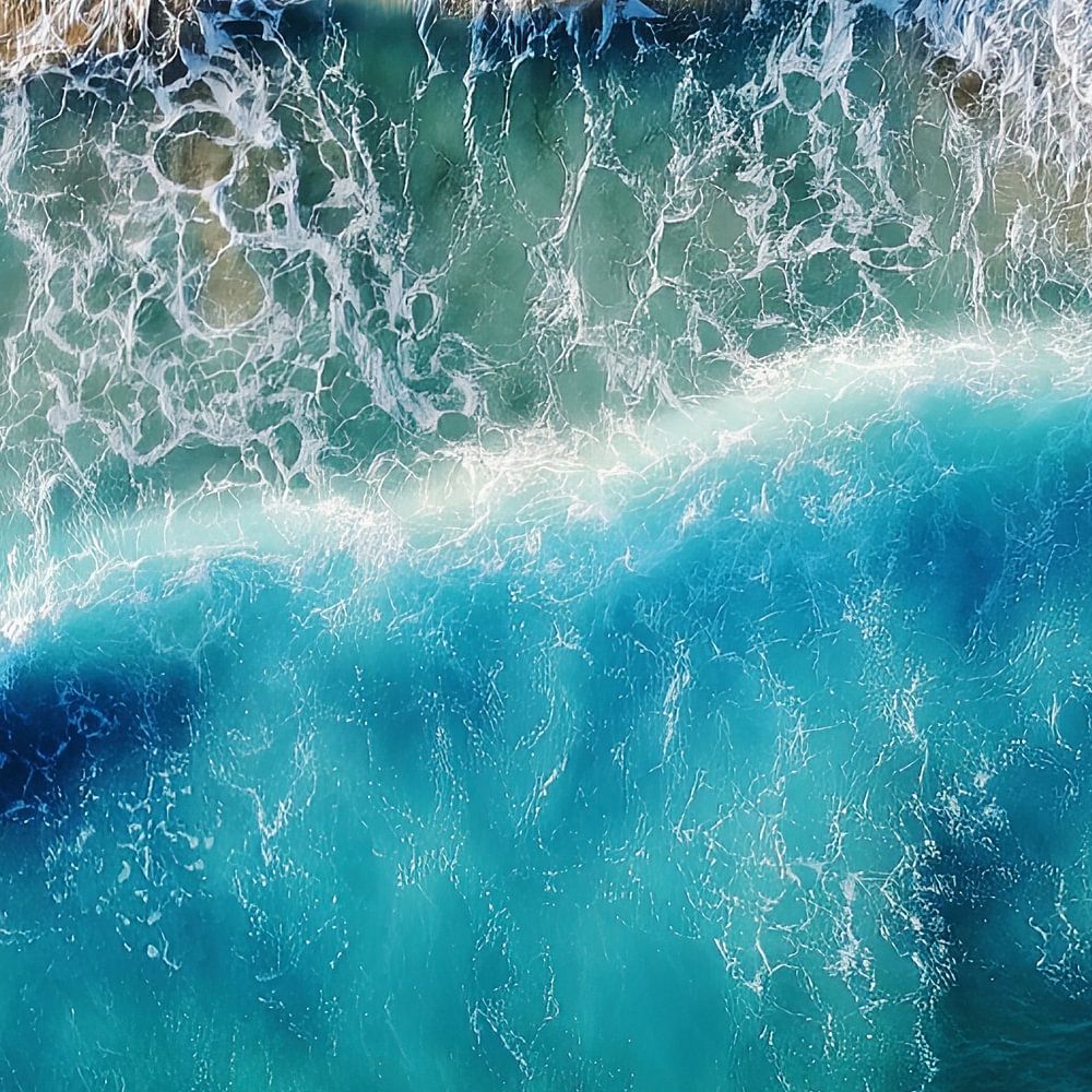 La palette de couleurs se compose de bleu profond, de turquoise vif, de blanc et de sable. La transition entre l'eau et le rivage est douce. Les couches de mousse donnent du rythme et de la texture. Le bord supérieur de l'image montre du sable sec contrastant avec la zone humide que la vague vient de recouvrir.