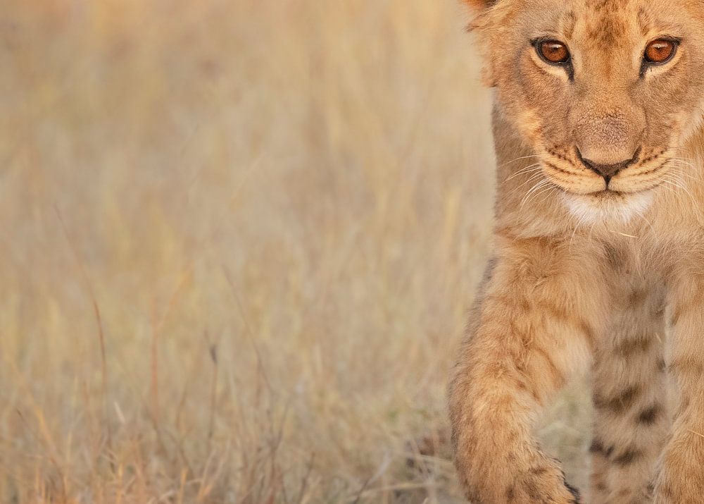 Le jeune lion marche vers la caméra dans la dernière lumière. Fabriqué au Botswana, en Afrique.