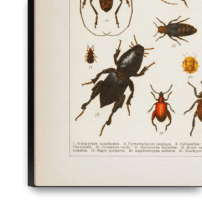 Une belle plaque extra-large présentant un certain nombre de coléoptères en couleur. Les noms latins sont indiqués sous la planche. Entre autres, macropus longimanus.