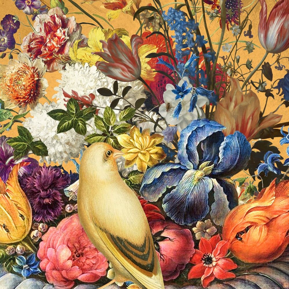 Beaucoup de couleurs dans cette œuvre d'art joyeuse avec une nature morte et un oiseau.