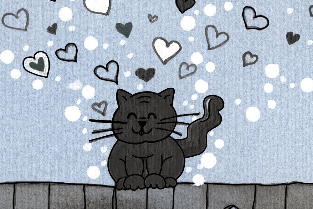 Jolie image à accrocher au mur pour les amoureux des chats, les fans de chats noirs ou tout simplement pour les personnes qui aiment l'image enfantine et amicale des chats et des cœurs et chez qui ce type de dessin fait sourire.