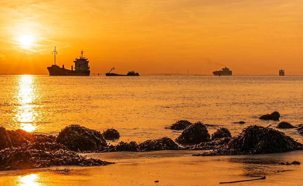 Le long de l'Escaut occidental, près de Waarde, le soleil couchant plonge le paysage dans un éclat d'or et d'orange. La boue brille comme du cuivre liquide et chaque vague reflète une dernière lueur avant que le jour ne se retire. À l'horizon, des paquebots glissent lentement - silhouettes dans le soleil du soir, en route vers des rivages lointains.