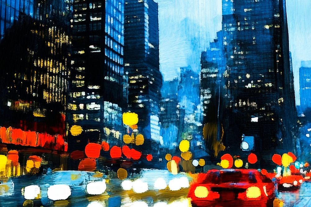 Au milieu de l'agitation urbaine, la scène s'illumine de fascinantes nuances de bleu et d'or. Les reflets des lumières dansent sur les rues mouillées et confèrent au moment une énergie vivante. Idéal pour un salon moderne ou un bureau créatif, où l'esprit vibrant de la ville peut être source d'inspiration.