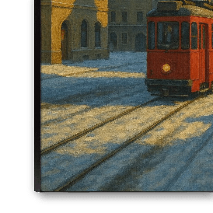 Exécutée dans un style alpin réaliste et cinématographique influencé par Edward Hopper, l'œuvre capture un moment fugace de mouvement à travers la sérénité. Le reflet du tramway brille faiblement sur les rails saupoudrés de neige alors qu'il disparaît dans la brume éclairée par le soleil. Chaque détail - des ombres sur les façades au ciel pâle au-dessus - parle de l'harmonie entre la lumière et l'architecture.