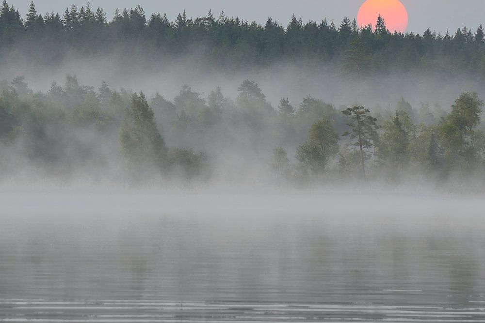 Lune avec formation de brouillard au-dessus d'un lac en Suède, à l'aube. Silence romantique