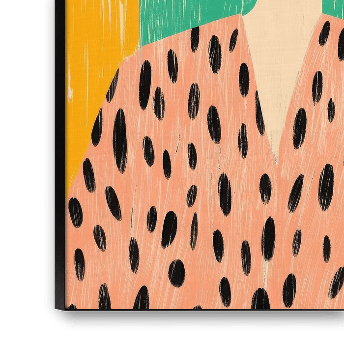 Une illustration stylisée et minimaliste d'une personne aux cheveux noirs en chignon haut, portant des lunettes de soleil. Elle porte un haut couleur pêche avec des polka-dots noirs irréguliers. L'arrière-plan est composé de coups de pinceau abstraits jaunes et turquoises qui forment un contraste dynamique et coloré avec le personnage. L'illustration est plate et graphique, avec des lignes de contour vives et des couleurs vives qui font ressortir le motif central.