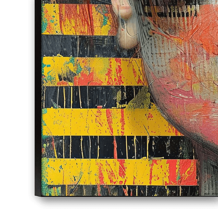 In de compositie werken zonnebril en lippen samen als twee steden op één kaart: de bovenste helft is grafisch en ritmisch, de onderste helft organisch en emotioneel. De keuze voor krachtige, primaire contrasten — gele en rode patronen in de glazentegenoverdewarmeroodtintenvandemond—zorgtvooreenonmiddellijkeleesbaarheid.Daarnaastisersubtieletextuuroverhethelegezichtdiedelagenmetelkaarverbindt:krassen,lichteimpasto,enkleinekleurvervuilingendiesuggererendathetgezichtdeelisvaneengrotereomgeving.Ditisnietalleeneenvrouwschilderijmaartegelijkeenexperimentinhoetweeelementen—zonnebrilschilderijenlippenschilderij—eenheelportretkunnendefiniërenzonderdaterveelmeernodigis.